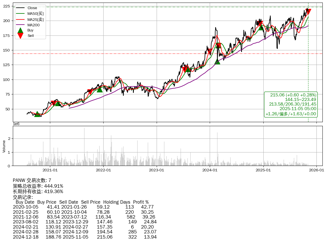 | 4 | ★PANW | $213.12(-1.44 -0.67% 2025-11-05 14:59) | 📉回撤 2025-10-28 -2.84% (7天) 214.46(2025-11-03) → 221.34(2025-10-27) (-3.11%) | +444.91% | +419.36% | +25.56% | 7 | 偏多/1.63/0.00 | 2020-07-27~2025-11-05 |