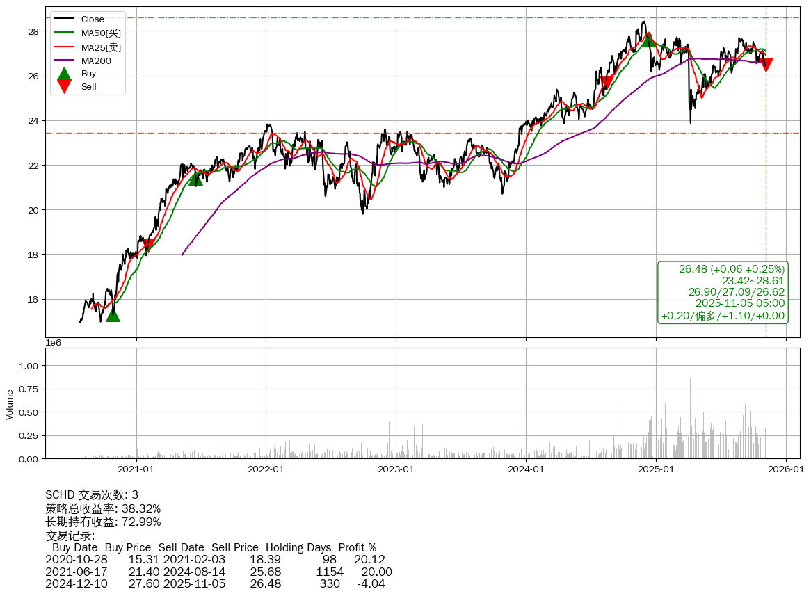 | 37 | ★SCHD | $26.58(+0.16 +0.61% 2025-11-05 14:59) | 📉回撤 2024-12-01 -6.84% (338天) 23.87(2025-04-07) → 28.43(2024-11-28) (-16.04%) | +38.32% | +72.99% | -34.67% | 3 | 偏多/1.1/0.00 | 2020-07-27~2025-11-05 |