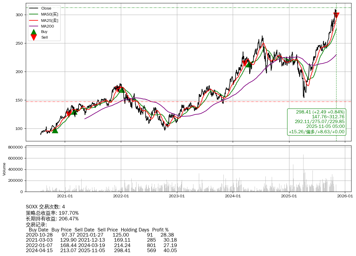 | 12 | ★SOXX | $305.39(+9.46 +3.20% 2025-11-05 14:59) | 📉回撤 2025-10-29 -3.66% (6天) 295.92(2025-11-03) → 309.74(2025-10-28) (-4.46%) | +197.70% | +206.47% | -8.77% | 4 | 偏多/8.62/0.00 | 2020-07-27~2025-11-05 |