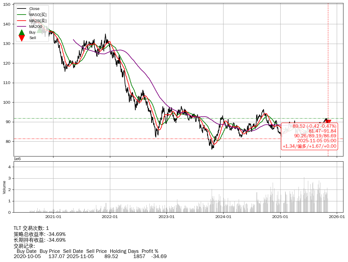 | 41 | ★TLT | $88.94(-1.00 -1.11% 2025-11-05 14:59) | 📉跌破 MA5 均线 📉回撤 2020-08-04 -39.14% (1918天) 75.95(2023-10-18) → 147.08(2020-08-03) (-48.36%) | -34.69% | -34.69% | +0.00% | 1 | 偏多/1.67/0.00 | 2020-07-27~2025-11-05 |