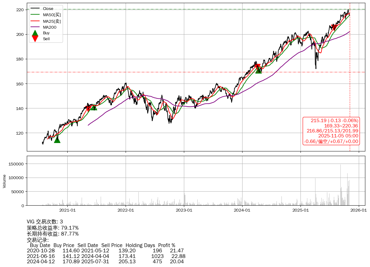 | 31 | ★VIG | $216.26(+0.87 +0.40% 2025-11-05 14:59) | 📉回撤 2025-10-27 -2.17% (8天) 215.19(2025-11-04) → 219.97(2025-10-26) (-2.17%) | +79.17% | +87.77% | -8.60% | 3 | 偏空/0.67/0.00 | 2020-07-27~2025-11-05 |