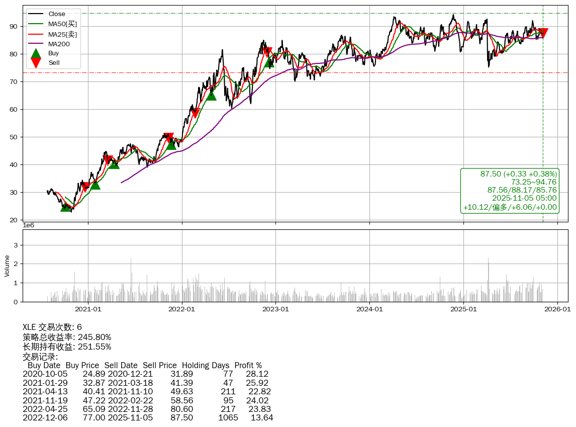| 10 | ★XLE | $87.41(+0.23 +0.26% 2025-11-05 14:59) | 📉回撤 2024-11-24 -7.03% (345天) 75.19(2025-04-07) → 94.12(2024-11-21) (-20.11%) | +245.80% | +251.55% | -5.74% | 6 | 偏多/6.06/0.00 | 2020-07-27~2025-11-05 |