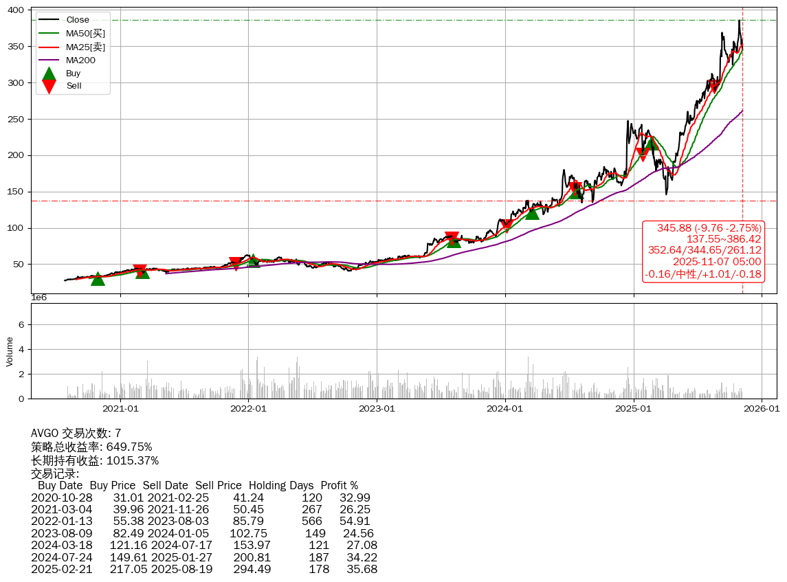 | 3 | ★AVGO | $349.48(-6.28 -1.77%) 11-07 14:59 355.76 11-06 | 📉跌破 MA5/25 均线 📉回撤 10-29 -10.38% (8天) 385.92(10-28)→345.88(11-06) | +649.75% | +1015.37% | -365.61% | 7 | 中性/1.01/-0.18 | 2020-07-27~2025-11-07 |