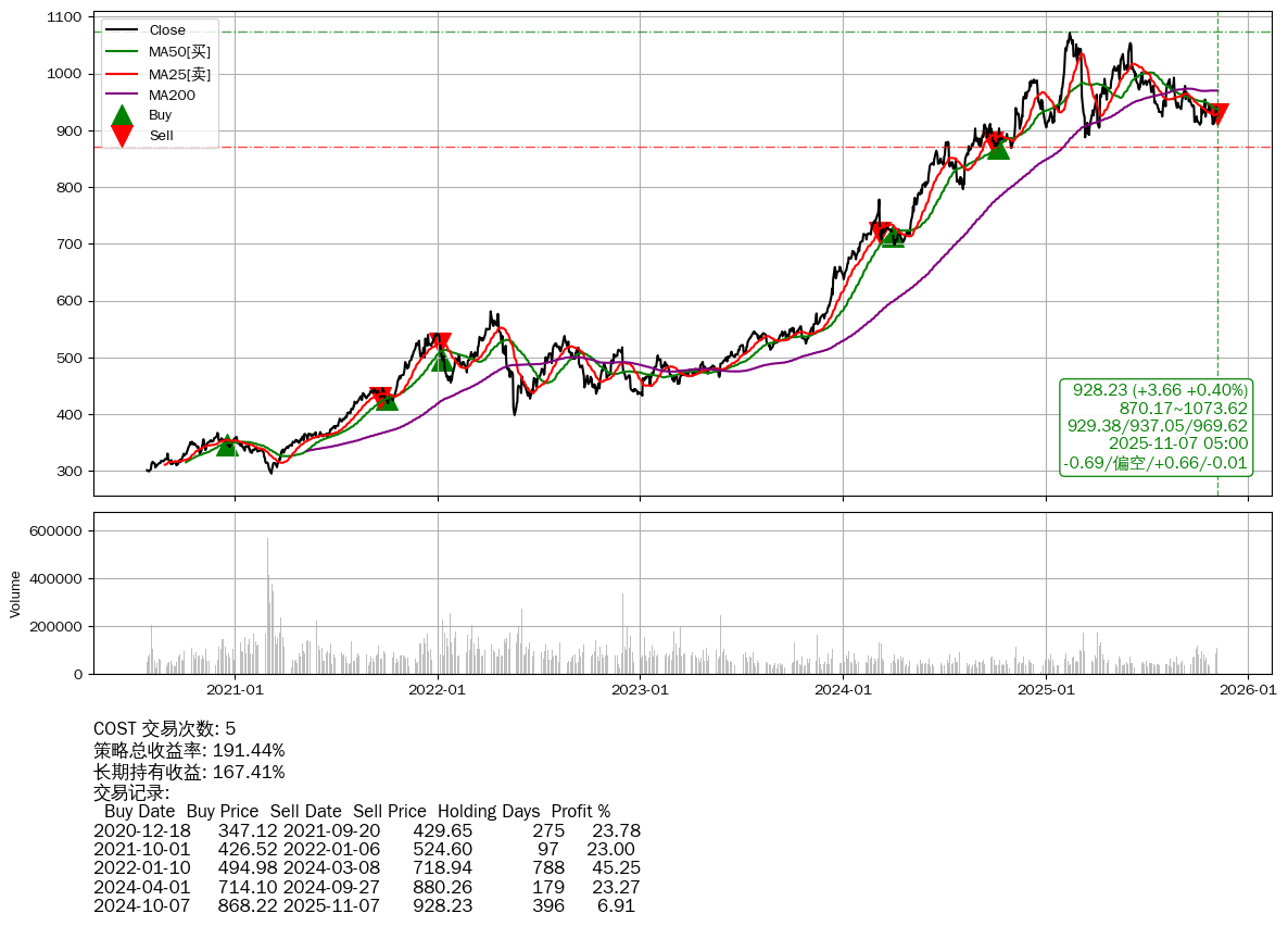 | 13 | ★COST | $922.53(-1.30 -0.14%) 11-07 14:59 923.83 11-06 | 📈涨破 MA10 均线 📉回撤 02-13 -13.40% (266天) 1071.88(02-12)→887.47(03-12) | +191.44% | +167.41% | +24.03% | 5 | 偏空/0.66/-0.01 | 2020-07-27~2025-11-07 |