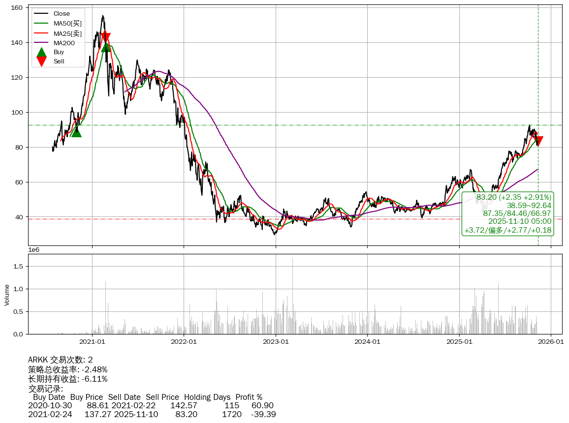 | 34 | ★ARKK | $82.82(+1.97 +2.44%) 11-10 14:59 80.85 11-07 | 📈涨破 MA5 均线 📉回撤 2021-02-15 -46.42% (1728天) 155.27(2021-02-11)→29.66(2022-12-27) | -2.48% | -6.11% | +3.63% | 2 | 偏多/2.8/0.18 | 2020-07-27~2025-11-10 |