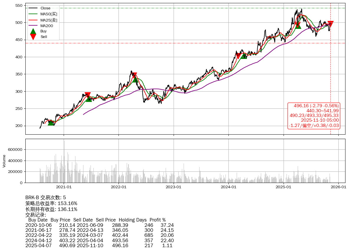 | 17 | ★BRK-B | $497.02(-2.13 -0.43%) 11-10 14:59 499.15 11-07 | 📉回撤 05-04 -8.04% (189天) 539.56(05-01)→459.16(08-03) | +153.16% | +136.11% | +17.05% | 5 | 偏空/0.38/-0.03 | 2020-07-27~2025-11-10 |