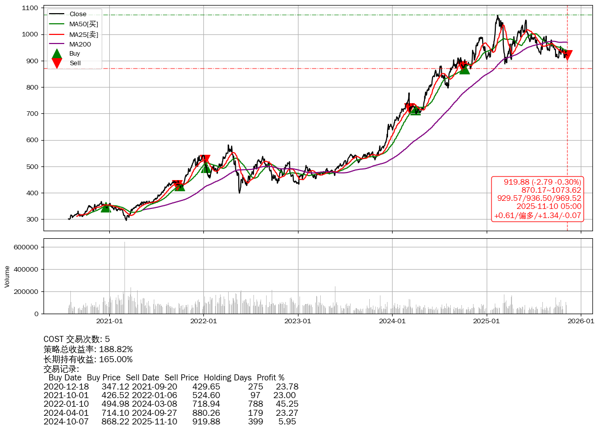 | 13 | ★COST | $915.43(-7.10 -0.77%) 11-10 14:59 922.53 11-07 | 📉回撤 02-13 -14.18% (269天) 1071.88(02-12)→887.47(03-12) | +188.82% | +165.00% | +23.82% | 5 | 偏多/1.32/-0.07 | 2020-07-27~2025-11-10 |
