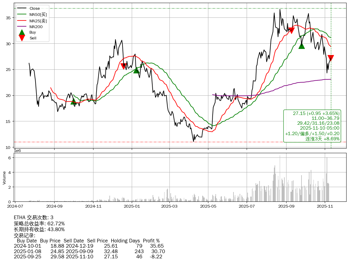 | 31 | ★ETHA | $26.99(+0.80 +3.05%) 11-10 14:59 26.19 11-07 | 📈连涨3天 +8.69% 📉回撤 08-24 -25.78% (77天) 36.58(08-21)→24.30(11-03) | +62.72% | +43.80% | +18.92% | 3 | 偏多/1.52/0.20 | 2024-07-23~2025-11-10 |