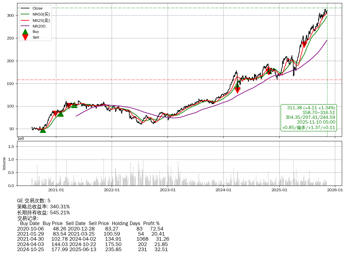 | 5 | ★GE | $311.99(+4.72 +1.54%) 11-10 14:59 307.27 11-07 | 📈涨破 MA10 均线 📉回撤 10-29 -0.85% (11天) 314.04(10-28)→304.05(11-03) | +340.31% | +545.21% | -204.90% | 5 | 偏多/1.37/0.11 | 2020-07-27~2025-11-10 |