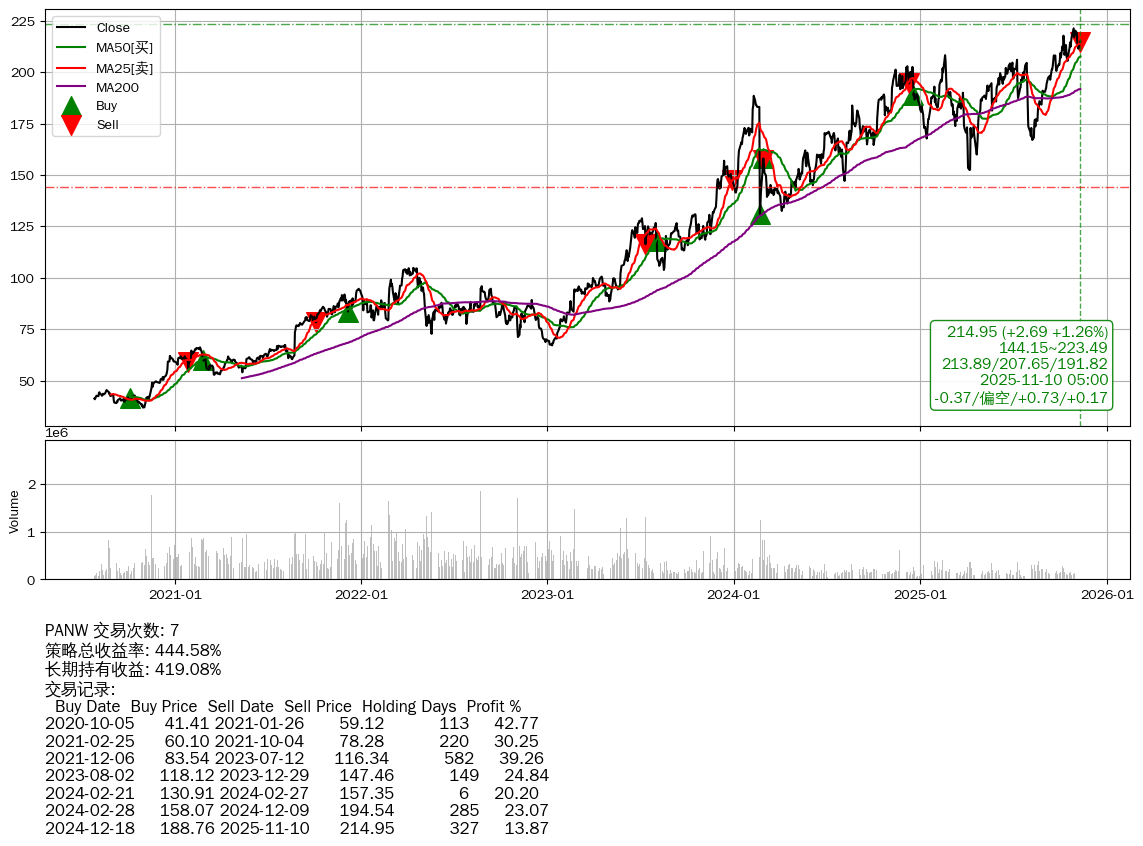 | 4 | ★PANW | $216.52(+4.25 +2.00%) 11-10 14:59 212.27 11-07 | 📈涨破 MA5/25 均线 📉回撤 10-28 -2.89% (12天) 221.34(10-27)→211.44(11-05) | +444.58% | +419.08% | +25.50% | 7 | 偏空/0.73/0.17 | 2020-07-27~2025-11-10 |