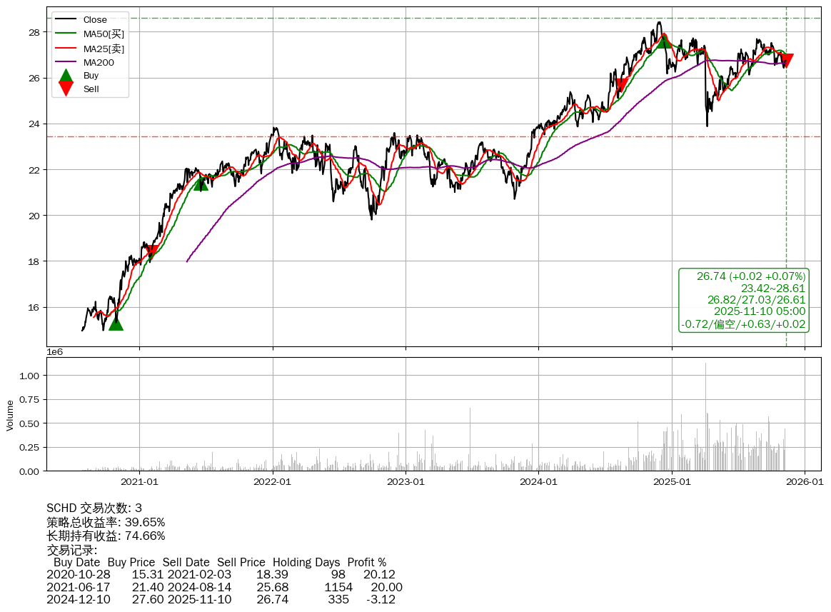 | 33 | ★SCHD | $26.75(+0.01 +0.04%) 11-10 14:59 26.74 11-07 | 📉回撤 2024-12-01 -5.94% (343天) 28.43(2024-11-28)→23.87(04-07) | +39.65% | +74.66% | -35.01% | 3 | 偏空/0.63/0.02 | 2020-07-27~2025-11-10 |