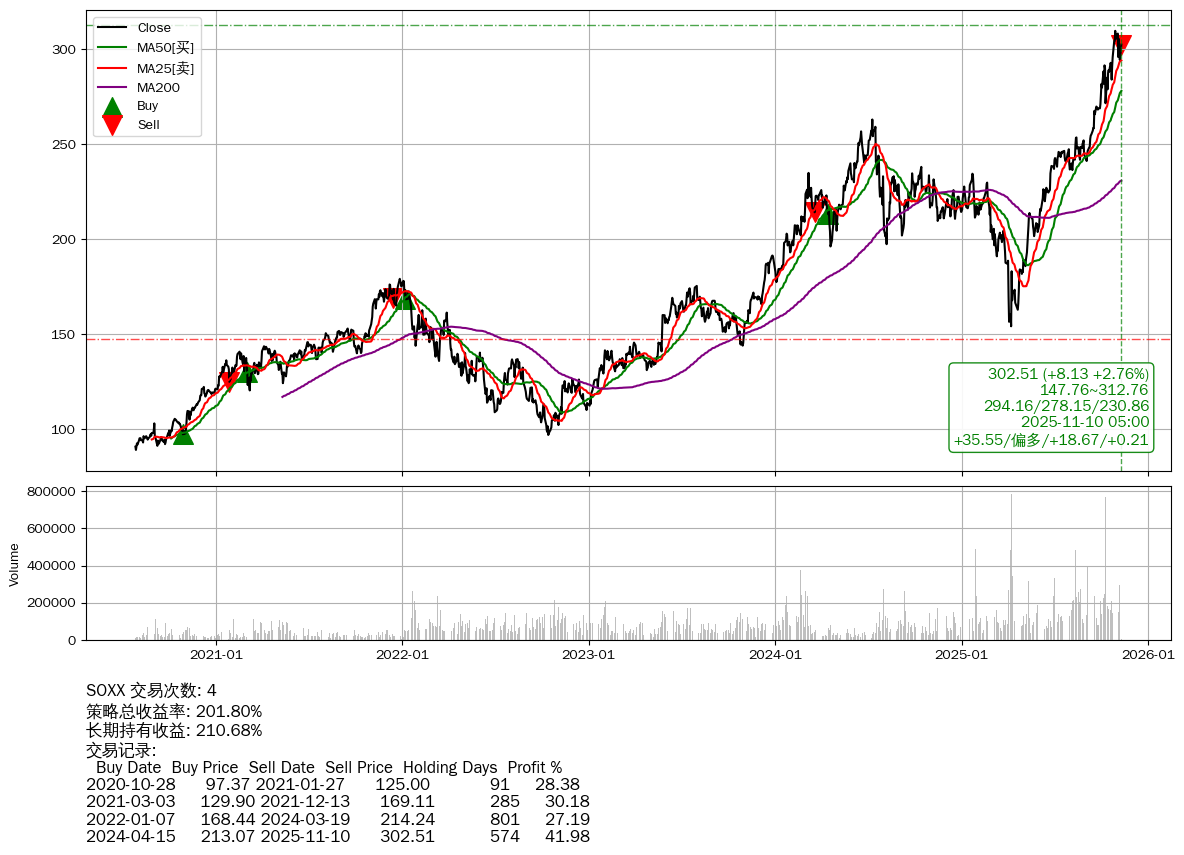 | 11 | ★SOXX | $302.12(+7.74 +2.63%) 11-10 14:59 294.38 11-07 | 📈涨破 MA5 均线 📉回撤 10-29 -2.33% (11天) 309.74(10-28)→294.38(11-06) | +201.80% | +210.68% | -8.88% | 4 | 偏多/18.67/0.21 | 2020-07-27~2025-11-10 |