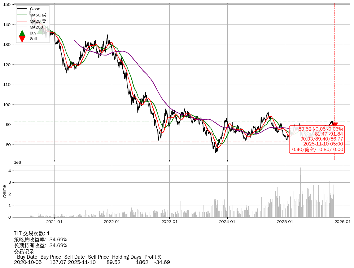 | 36 | ★TLT | $89.55(-0.02 -0.02%) 11-10 14:59 89.57 11-07 | 📉跌破 MA5 均线 📉回撤 2020-08-04 -39.14% (1923天) 147.08(2020-08-03)→75.95(2023-10-18) | -34.69% | -34.69% | +0.00% | 1 | 偏空/0.79/-0.00 | 2020-07-27~2025-11-10 |