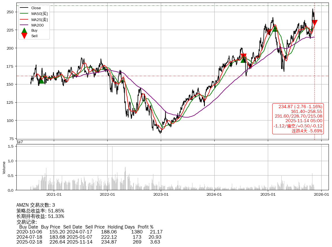 | 40 | ★AMZN | $234.70(-2.88 -1.21%) 11-14 14:59 237.58 11-13 | 📉连跌4天 -5.69% 📉回撤 11-03 -7.53% (10天) 253.99(11-02)→234.87(11-13) | +51.85% | +51.33% | +0.52% | 3 | 偏空/0.5/-0.12 | 2020-07-27~2025-11-14 |