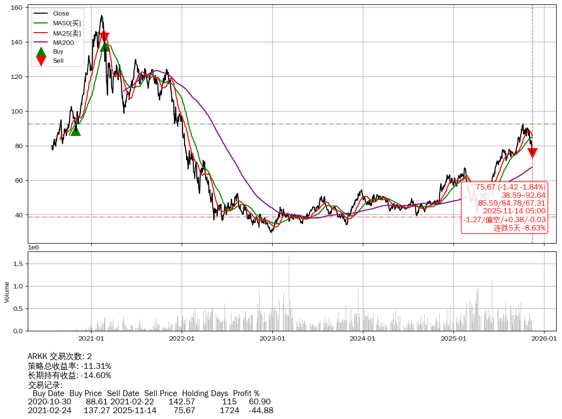 | 45 | ★ARKK | $77.03(-0.10 -0.13%) 11-14 14:59 77.13 11-13 | 📉连跌5天 -8.63% 📉回撤 2021-02-15 -51.27% (1732天) 155.27(2021-02-11)→29.66(2022-12-27) | -11.31% | -14.60% | +3.29% | 2 | 偏空/0.38/-0.03 | 2020-07-27~2025-11-14 |