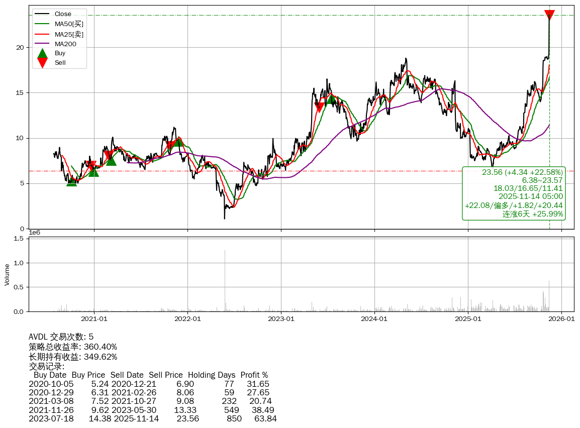 | 5 | 🟢AVDL | $23.57(+4.34 +22.57%) 11-14 14:59 19.23 11-13 | 📈涨破 MA5/10 均线 📈涨破 52周高点 (23.57) 📈连涨6天 +25.99% | +360.40% | +349.62% | +10.78% | 5 | 偏多/1.82/20.44 | 2020-07-27~2025-11-14 |