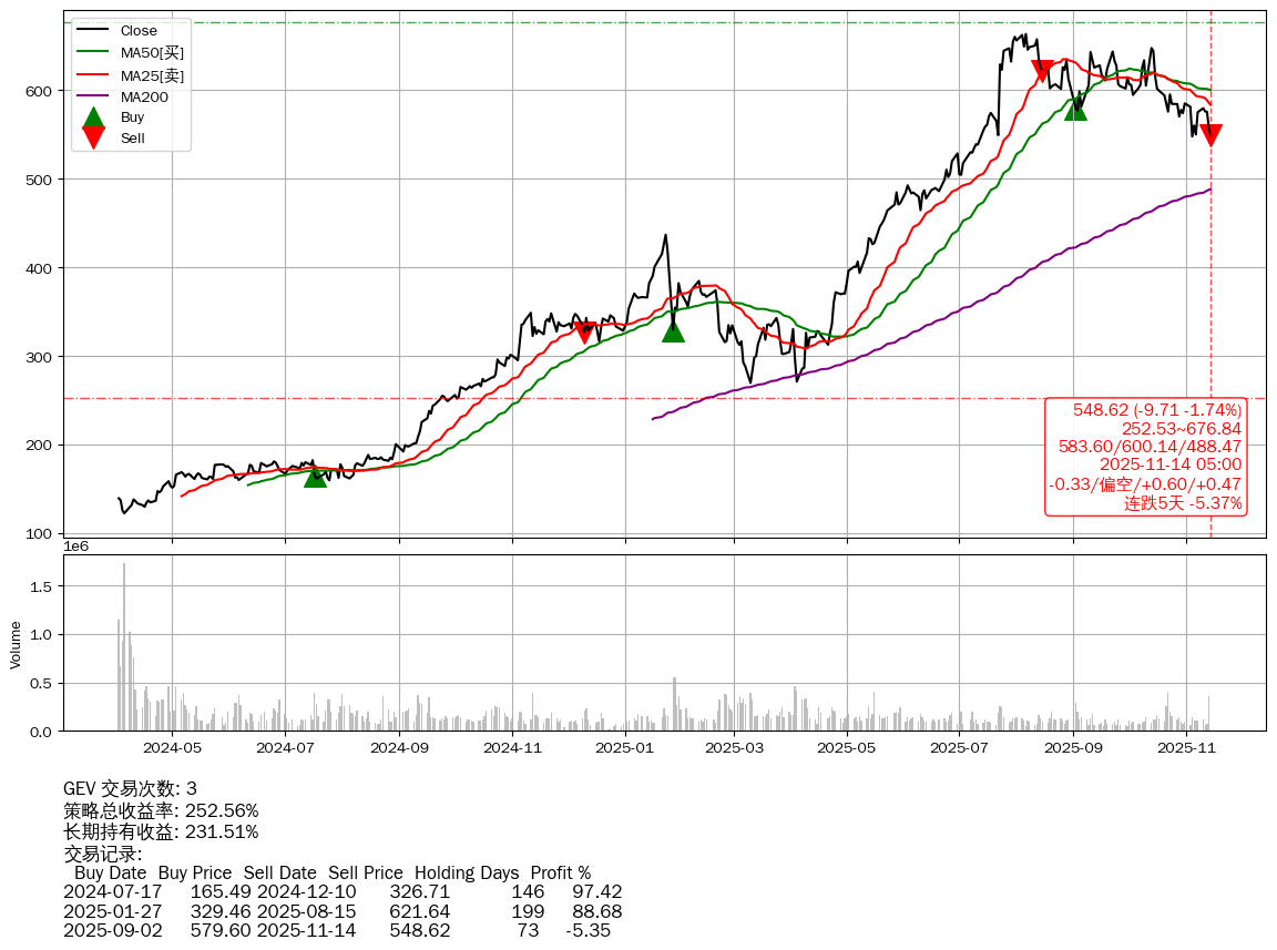 | 11 | 🟢★GEV | $578.50(+20.26 +3.63%) 11-14 14:59 558.24 11-13 | 📉连跌5天 -5.37% 📉回撤 08-06 -17.32% (99天) 663.56(08-05)→547.80(11-03) | +252.56% | +231.51% | +21.05% | 3 | 偏空/0.6/0.47 | 2024-04-02~2025-11-14 |