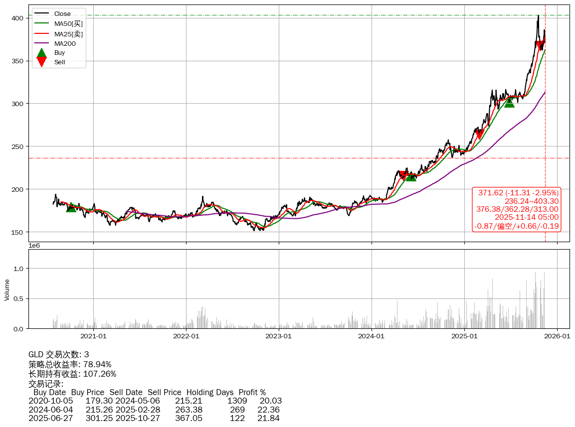 | 33 | ★GLD | $375.97(-7.01 -1.83%) 11-14 14:59 382.98 11-13 | 📉跌破 MA5/10/25 均线 📉回撤 10-20 -7.78% (24天) 402.95(10-19)→362.27(11-03) | +78.94% | +107.26% | -28.32% | 3 | 偏空/0.66/-0.19 | 2020-07-27~2025-11-14 |