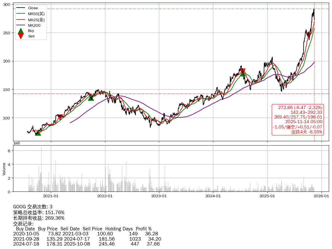 | 20 | ★GOOG | $277.01(-2.12 -0.76%) 11-14 14:59 279.13 11-13 | 📉连跌4天 -6.55% 📉回撤 11-11 -6.55% (2天) 291.76(11-10)→272.66(11-13) | +151.76% | +269.36% | -117.59% | 3 | 偏空/0.51/-0.07 | 2020-07-27~2025-11-14 |