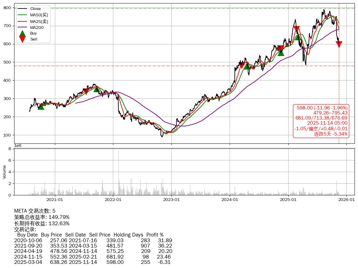 | 21 | ★META | $609.81(-0.16 -0.03%) 11-14 14:59 609.97 11-13 | 📉连跌5天 -5.34% 📉回撤 08-12 -24.23% (93天) 789.26(08-11)→598.00(11-13) | +149.79% | +132.63% | +17.16% | 5 | 偏空/0.48/-0.01 | 2020-07-27~2025-11-14 |