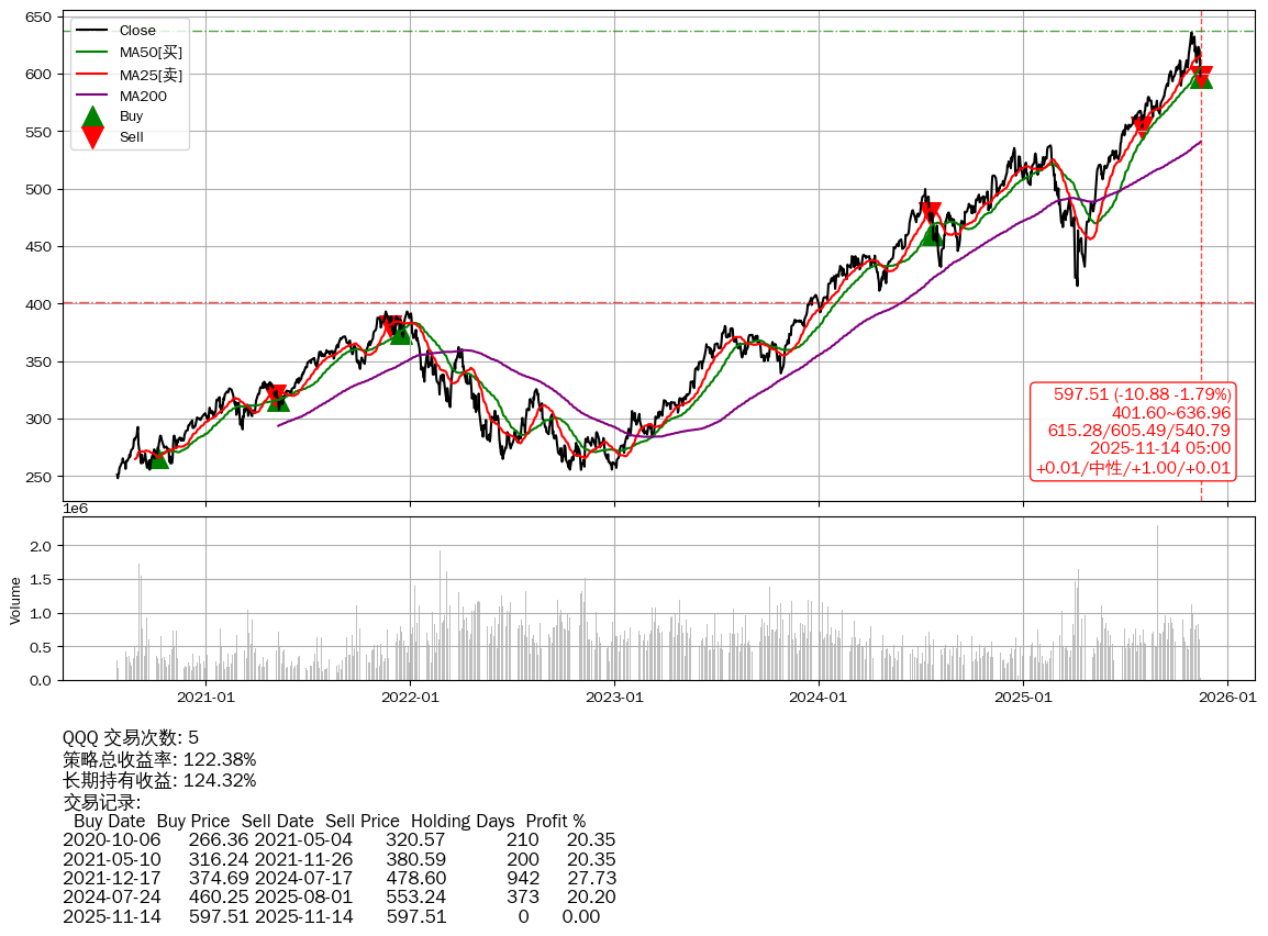 | 24 | ★QQQ | $608.81(+0.52 +0.09%) 11-14 14:59 608.29 11-13 | 📉跌破 MA50 均线 📉回撤 10-29 -6.03% (15天) 635.87(10-28)→597.51(11-13) | +122.38% | +124.32% | -1.95% | 5 | 中性/1.0/0.01 | 2020-07-27~2025-11-14 |