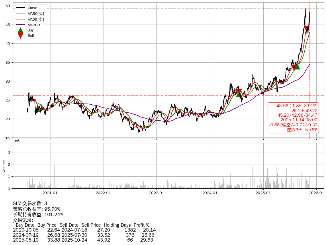 | 30 | ★SLV | $45.96(-1.48 -3.12%) 11-14 14:59 47.43 11-13 | 📉跌破 MA5 均线 📉连跌3天 -5.76% 📉回撤 10-16 -7.34% (28天) 49.17(10-15)→42.41(10-26) | +95.70% | +101.24% | -5.54% | 3 | 偏空/0.71/-0.32 | 2020-07-27~2025-11-14 |