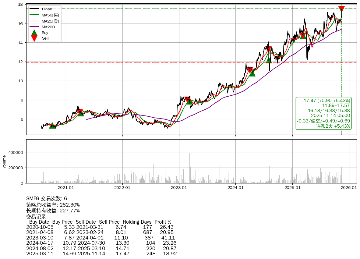 | 9 | 🟢SMFG | $17.47(+0.90 +5.43%) 11-14 14:59 16.57 11-13 | 📈涨破 MA5 均线 📈涨破 52周高点 (17.57) 📈连涨2天 +5.43% | +282.30% | +227.77% | +54.54% | 6 | 偏空/0.49/0.69 | 2020-07-27~2025-11-14 |