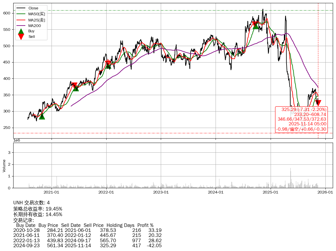 | 43 | ★UNH | $321.76(-10.76 -3.24%) 11-14 14:59 332.52 11-13 | 📉跌破 MA5/10 均线 📉回撤 2024-11-11 -46.87% (367天) 612.30(2024-11-10)→236.20(07-31) | +19.45% | +14.45% | +4.99% | 4 | 偏空/0.65/-0.30 | 2020-07-27~2025-11-14 |
