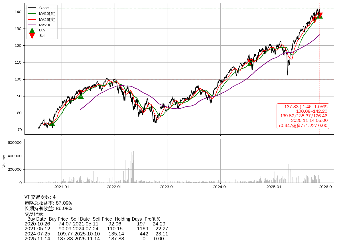 | 31 | ★VT | $139.24(-0.08 -0.06%) 11-14 14:59 139.32 11-13 | 📉跌破 MA50 均线 📉回撤 10-28 -2.77% (16天) 141.75(10-27)→137.83(11-13) | +87.09% | +86.08% | +1.01% | 4 | 偏多/1.22/-0.00 | 2020-07-27~2025-11-14 |