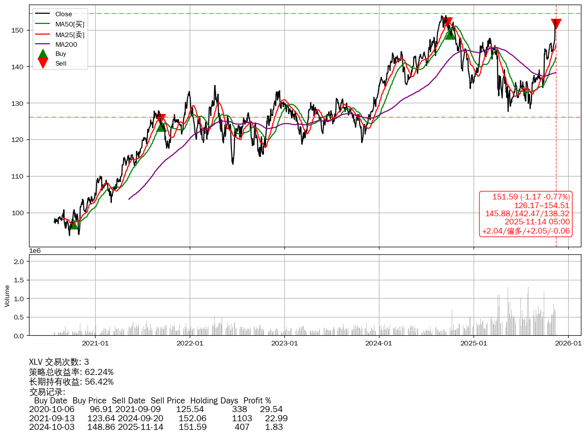 | 37 | ★XLV | $151.87(-0.89 -0.58%) 11-14 14:59 152.76 11-13 | 📉回撤 2024-09-16 -1.50% (423天) 153.90(2024-09-15)→127.62(05-13) | +62.24% | +56.42% | +5.81% | 3 | 偏多/2.05/-0.06 | 2020-07-27~2025-11-14 |