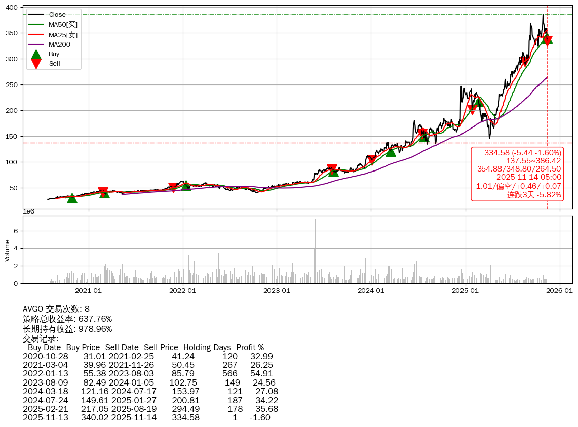 | 3 | ★AVGO | $342.58(+2.52 +0.74%) 11-14 14:59 340.06 11-13 | 📉连跌3天 -5.82% 📉回撤 10-29 -13.30% (15天) 385.92(10-28)→334.58(11-13) | +637.76% | +978.96% | -341.20% | 8 | 偏空/0.46/0.07 | 2020-07-27~2025-11-14 |