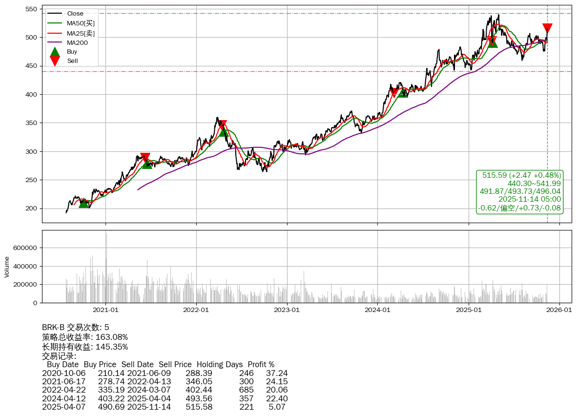 | 17 | ★BRK-B | $509.00(-4.19 -0.82%) 11-14 14:59 513.19 11-13 | 📉回撤 05-04 -4.44% (193天) 539.56(05-01)→459.16(08-03) | +163.08% | +145.35% | +17.73% | 5 | 偏空/0.73/-0.08 | 2020-07-27~2025-11-14 |
