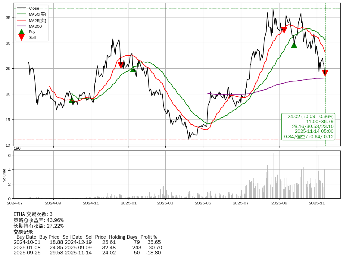 | 38 | ★ETHA | $23.69(-0.24 -1.00%) 11-14 14:59 23.93 11-13 | 📉回撤 08-24 -34.34% (81天) 36.58(08-21)→23.93(11-12) | +43.96% | +27.22% | +16.74% | 3 | 偏空/0.64/-0.12 | 2024-07-23~2025-11-14 |