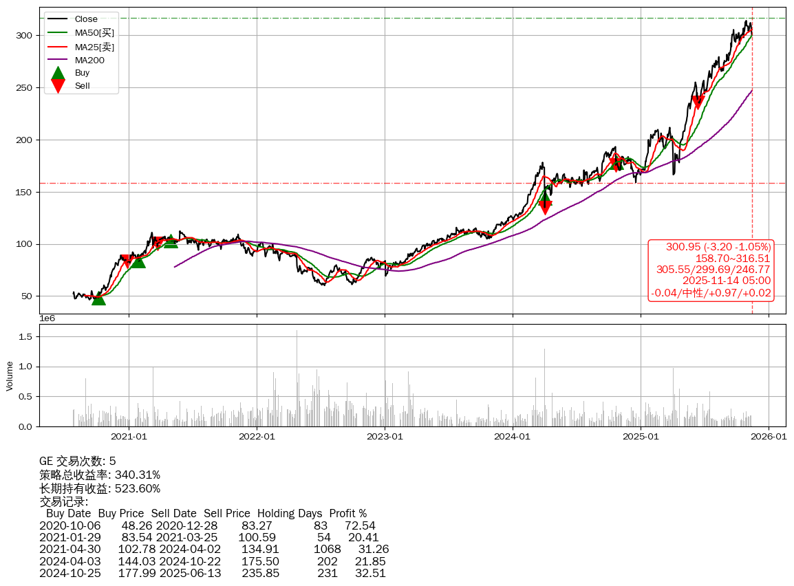 | 5 | ★GE | $304.89(+0.67 +0.22%) 11-14 14:59 304.22 11-13 | 📉回撤 10-29 -4.17% (15天) 314.04(10-28)→300.95(11-13) | +340.31% | +523.60% | -183.29% | 5 | 中性/0.97/0.02 | 2020-07-27~2025-11-14 |