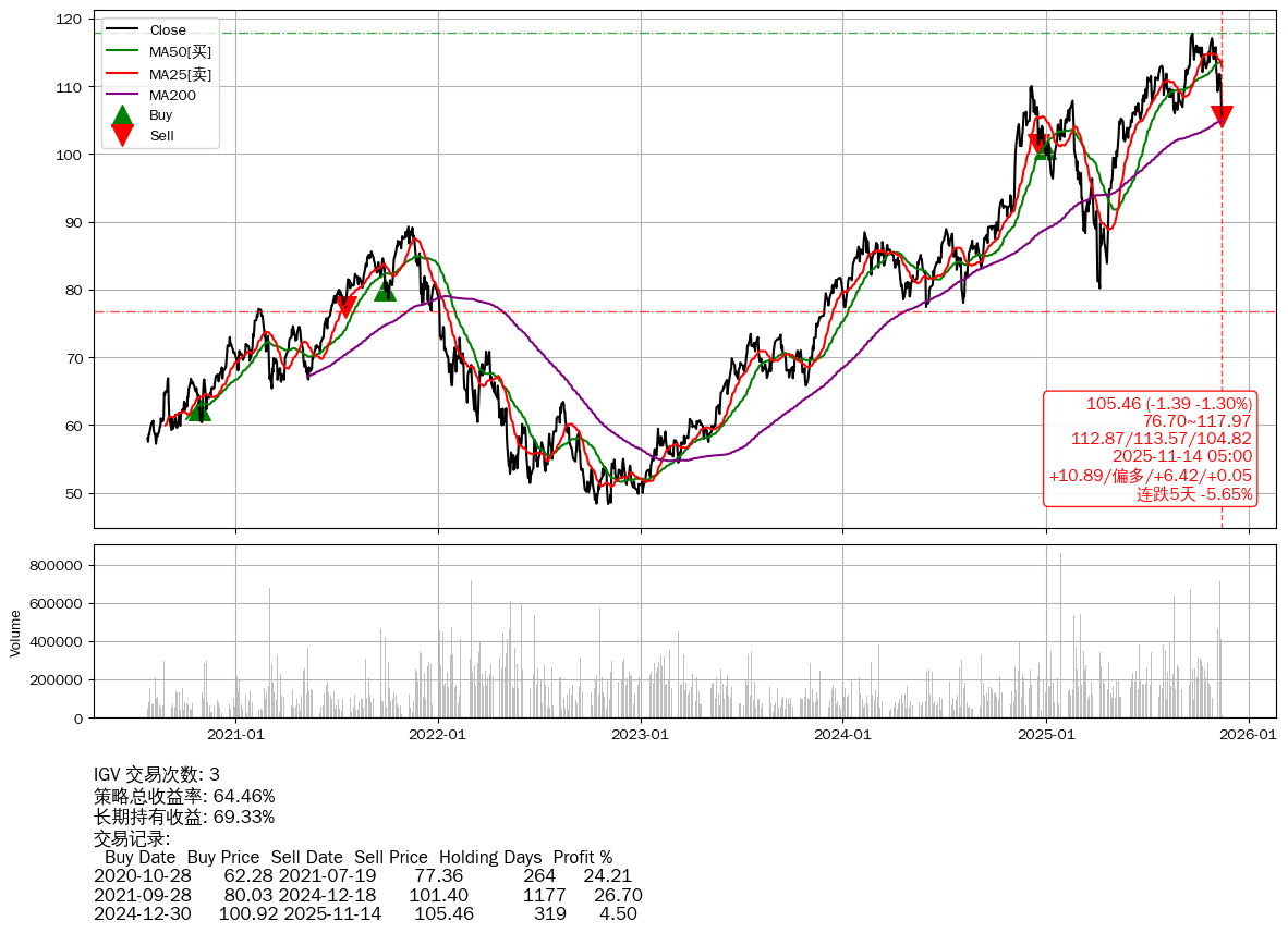 | 33 | ★IGV | $107.49(+0.65 +0.61%) 11-14 14:59 106.84 11-13 | 📉连跌5天 -5.65% 📉回撤 09-22 -10.46% (52天) 117.78(09-21)→105.46(11-13) | +64.46% | +69.33% | -4.88% | 3 | 偏多/6.42/0.05 | 2020-07-27~2025-11-14 |