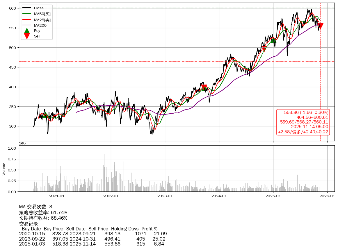 | 26 | ★SPY | $671.95(-0.10 -0.01%) 11-14 14:59 672.05 11-13 | 📉跌破 MA50 均线 📉回撤 10-29 -3.47% (15天) 687.32(10-28)→663.46(11-13) | +116.07% | +112.55% | +3.52% | 4 | 偏空/0.9/-0.00 | 2020-07-27~2025-11-14 |