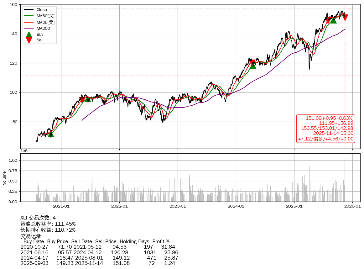 | 27 | ★XLI | $152.07(+0.03 +0.02%) 11-14 14:59 152.04 11-13 | 📉跌破 MA100 均线 📉回撤 10-27 -3.02% (17天) 155.78(10-26)→151.09(11-13) | +111.45% | +110.72% | +0.73% | 4 | 偏多/4.56/0.00 | 2020-07-27~2025-11-14 |