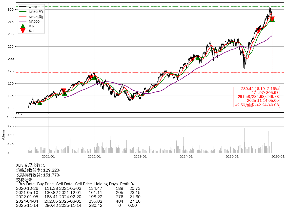 | 20 | ★XLK | $288.20(+1.64 +0.57%) 11-14 14:59 286.56 11-13 | 📉跌破 MA50 均线 📉回撤 10-29 -7.80% (15天) 304.15(10-28)→280.42(11-13) | +129.22% | +151.77% | -22.55% | 5 | 偏多/2.24/0.08 | 2020-07-27~2025-11-14 |
