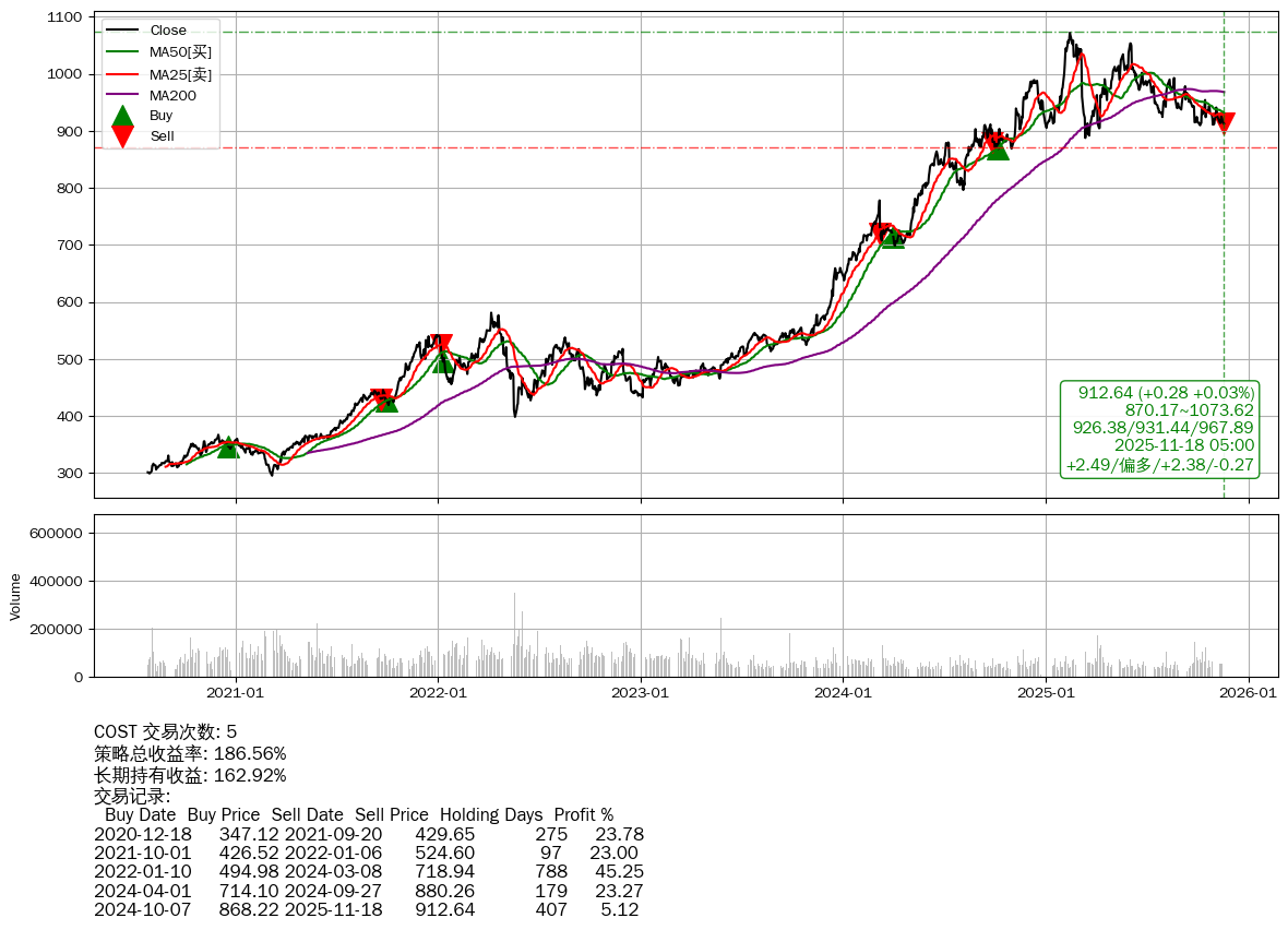 | 13 | ★COST | $894.94(-17.68 -1.94%) 11-18 14:59 912.62 11-17 | 📉回撤 02-13 -14.86% (277天) 1071.88(02-12)→887.47(03-12) | +186.56% | +162.92% | +23.64% | 5 | 偏多/2.38/-0.27 | 2020-07-27~2025-11-18 |