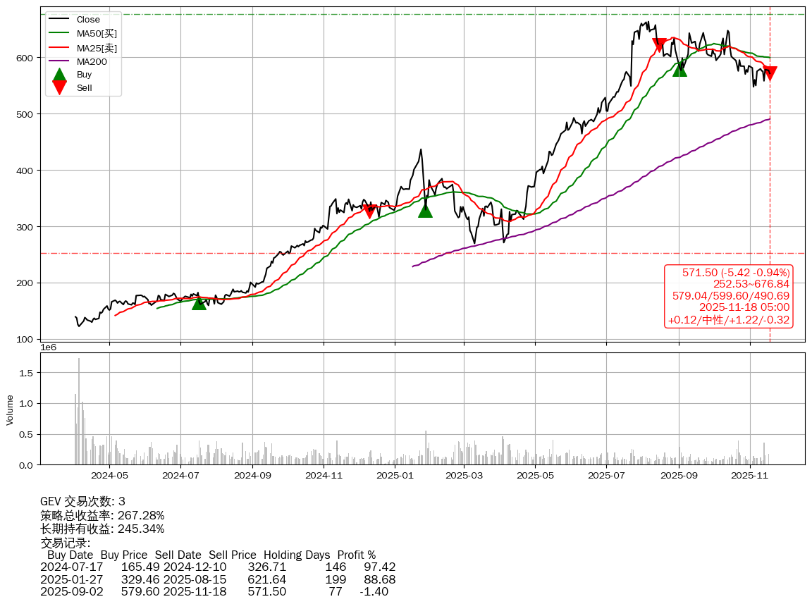 | 7 | ★GEV | $554.66(-22.36 -3.88%) 11-18 14:59 577.02 11-17 | 📉跌破 MA5 均线 📉回撤 08-06 -13.87% (103天) 663.56(08-05)→547.80(11-03) | +267.28% | +245.34% | +21.94% | 3 | 偏多/1.26/-0.32 | 2024-04-02~2025-11-18 |
