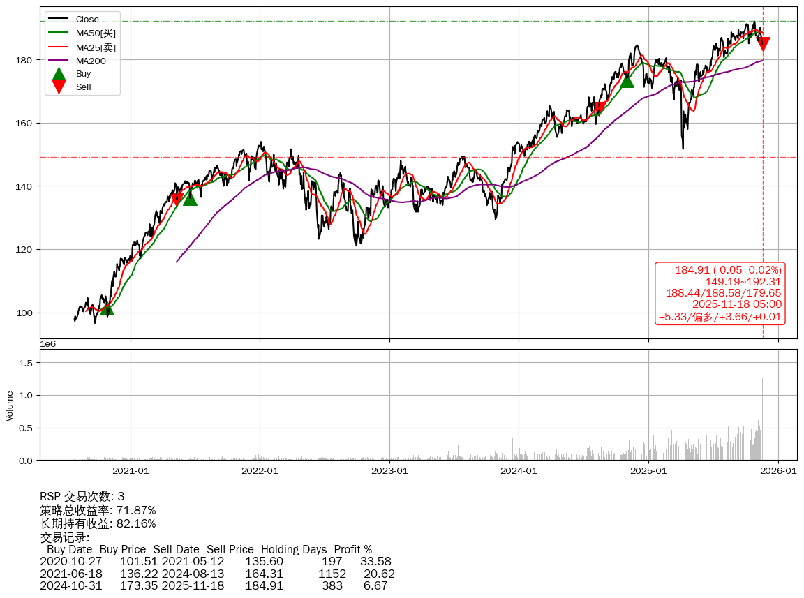 | 31 | ★RSP | $184.89(-0.04 -0.02%) 11-18 14:59 184.93 11-17 | 📉回撤 10-27 -3.74% (21天) 192.09(10-26)→184.91(11-17) | +71.87% | +82.16% | -10.29% | 3 | 偏多/3.66/0.01 | 2020-07-27~2025-11-18 |