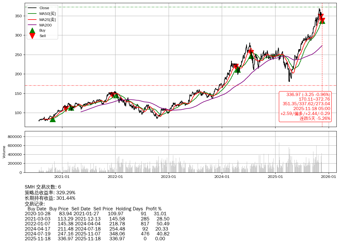 | 5 | ★SMH | $332.90(-7.32 -2.15%) 11-18 14:59 340.22 11-17 | 📉跌破 MA50 均线 📉连跌5天 -5.26% 📉回撤 10-29 -8.70% (19天) 369.08(10-28)→336.97(11-17) | +329.29% | +301.44% | +27.85% | 6 | 偏多/2.44/-0.29 | 2020-07-27~2025-11-18 |