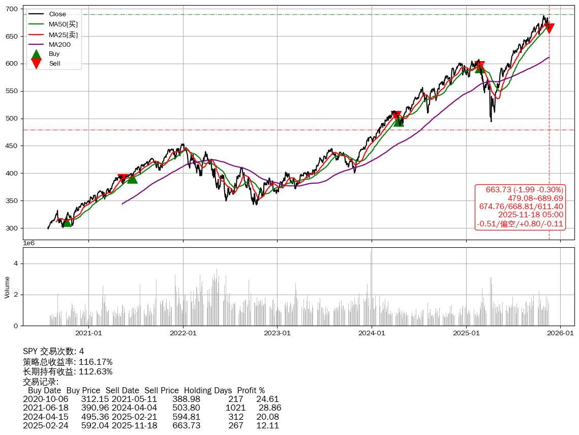 | 25 | ★SPY | $660.14(-5.55 -0.83%) 11-18 14:59 665.69 11-17 | 📉回撤 10-29 -3.43% (19天) 687.32(10-28)→663.73(11-17) | +116.17% | +112.63% | +3.53% | 4 | 偏空/0.8/-0.11 | 2020-07-27~2025-11-18 |