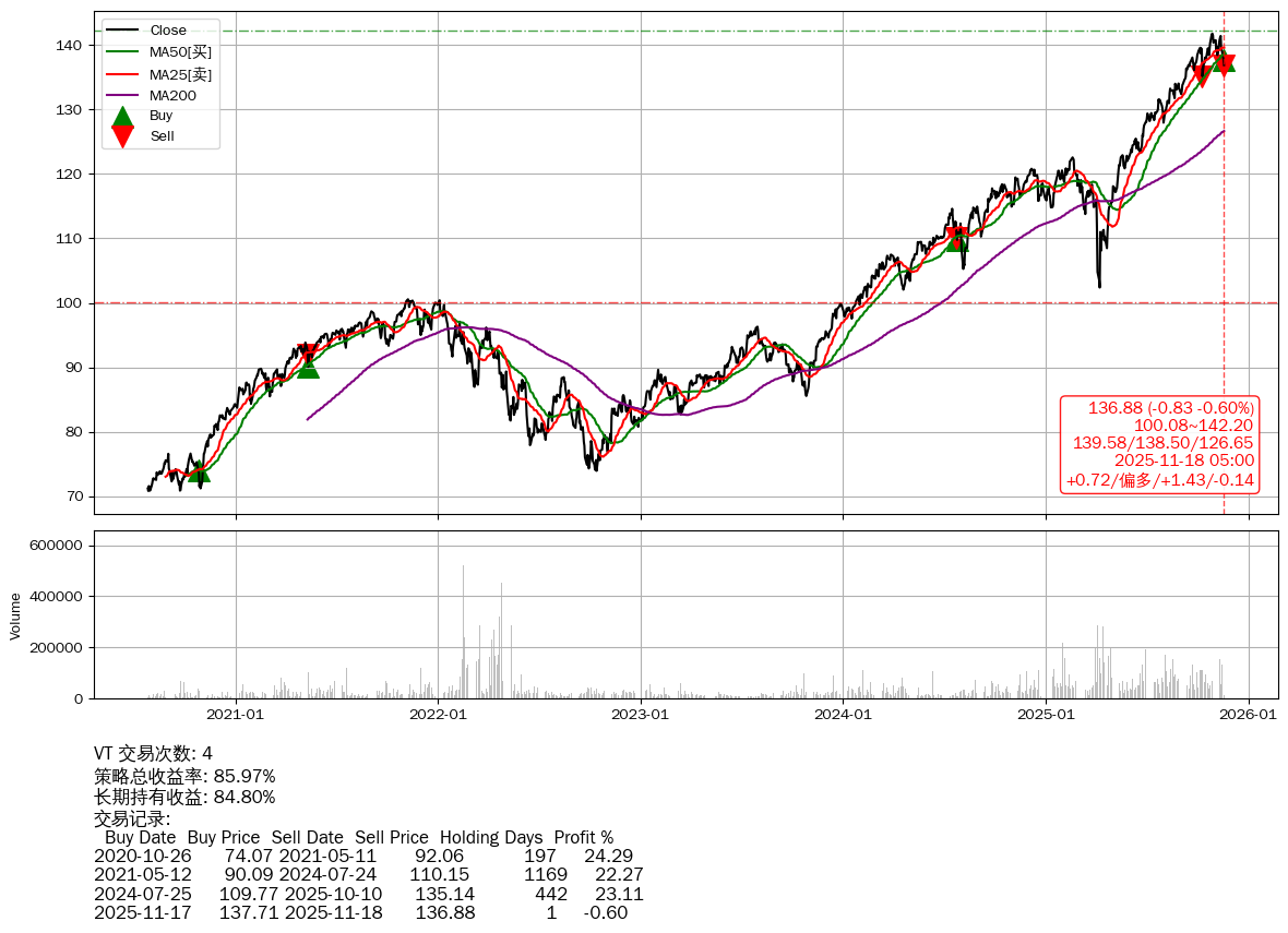 | 27 | ★VT | $136.67(-1.05 -0.76%) 11-18 14:59 137.72 11-17 | 📉回撤 10-28 -3.44% (20天) 141.75(10-27)→136.88(11-17) | +85.97% | +84.80% | +1.17% | 4 | 偏多/1.43/-0.14 | 2020-07-27~2025-11-18 |