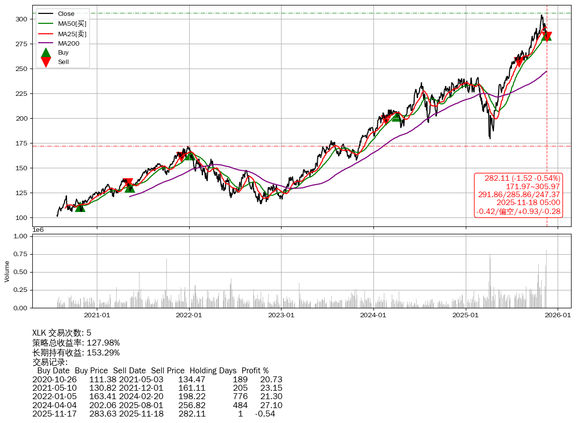 | 20 | ★XLK | $278.90(-4.73 -1.67%) 11-18 14:59 283.63 11-17 | 📉回撤 10-29 -7.25% (19天) 304.15(10-28)→282.11(11-17) | +127.98% | +153.29% | -25.30% | 5 | 偏空/0.94/-0.28 | 2020-07-27~2025-11-18 |