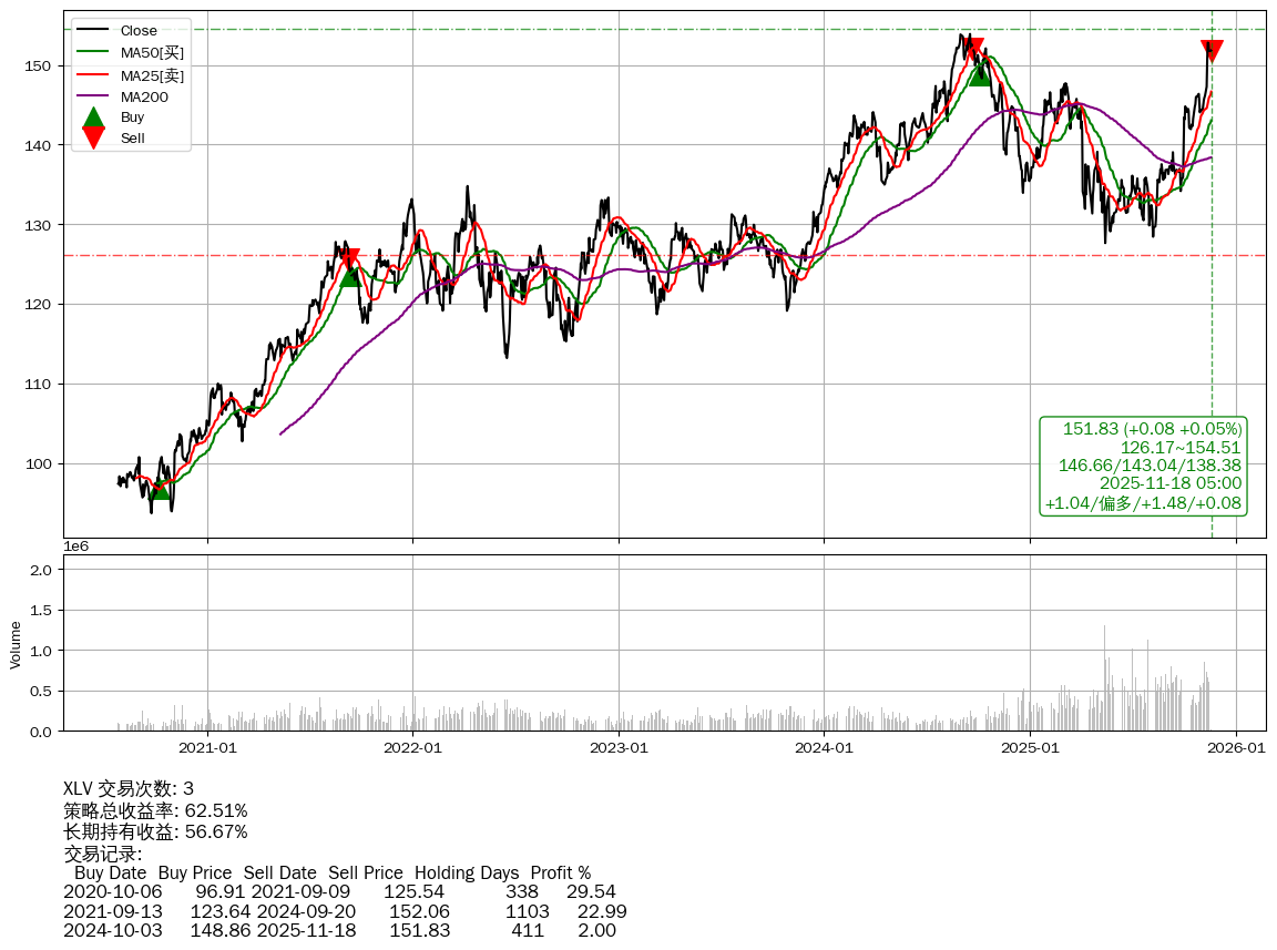 | 32 | ★XLV | $152.58(+0.84 +0.55%) 11-18 14:59 151.74 11-17 | 📉回撤 2024-09-16 -1.35% (427天) 153.90(2024-09-15)→127.62(05-13) | +62.51% | +56.67% | +5.84% | 3 | 偏多/1.48/0.08 | 2020-07-27~2025-11-18 |
