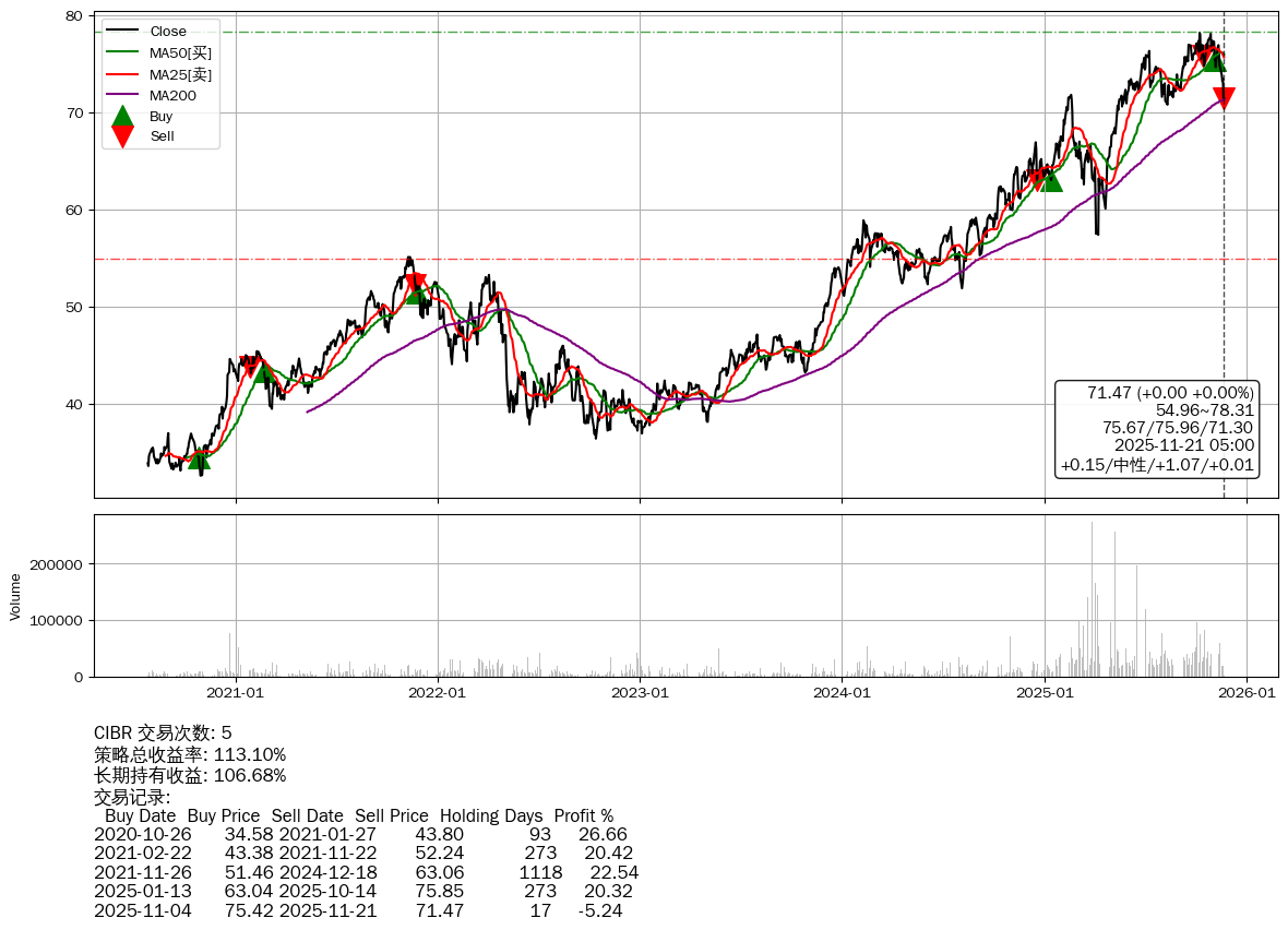 | 28 | ★CIBR | $71.57(+0.07 +0.10%) 11-21 14:59 71.50 11-20 | 📉回撤 10-08 -8.59% (43天) 78.19(10-07)→71.47(11-19) | +113.10% | +106.68% | +6.42% | 5 | 中性/1.07/0.01 | 2020-07-27~2025-11-21 |