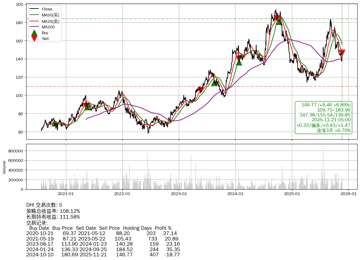 | 29 | DHI | $146.76(+9.43 +6.87%) 11-21 14:59 137.33 11-20 | 📈涨破 MA5/10/200 均线 📈连涨3天 +6.70% 📉回撤 2024-09-19 -24.40% (427天) 194.15(2024-09-18)→114.05(04-07) | +108.12% | +111.58% | -3.45% | 5 | 偏多/0.43/1.47 | 2020-07-27~2025-11-21 |