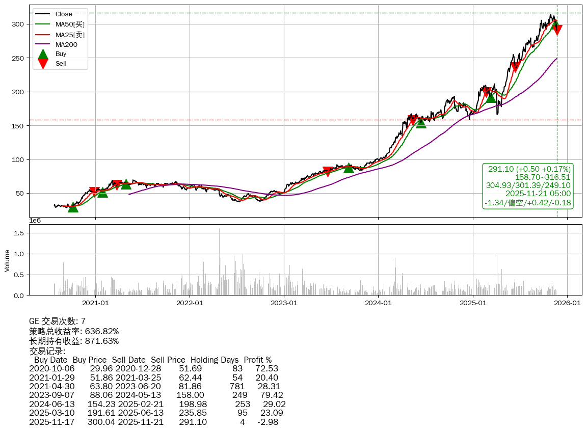 | 4 | ★GE | $287.39(-3.29 -1.13%) 11-21 14:59 290.68 11-20 | 📉回撤 10-29 -7.30% (22天) 314.04(10-28)→290.60(11-19) | +636.82% | +871.63% | -234.81% | 7 | 偏空/0.42/-0.18 | 2020-07-27~2025-11-21 |
