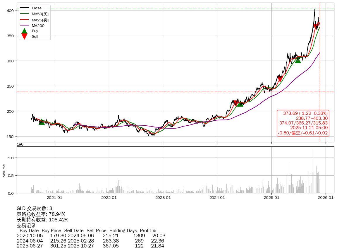 | 35 | ★GLD | $374.22(-0.70 -0.19%) 11-21 14:59 374.92 11-20 | 📉跌破 MA5/25 均线 📉回撤 10-20 -7.26% (31天) 402.95(10-19)→362.27(11-03) | +78.94% | +108.42% | -29.47% | 3 | 偏空/0.61/-0.02 | 2020-07-27~2025-11-21 |